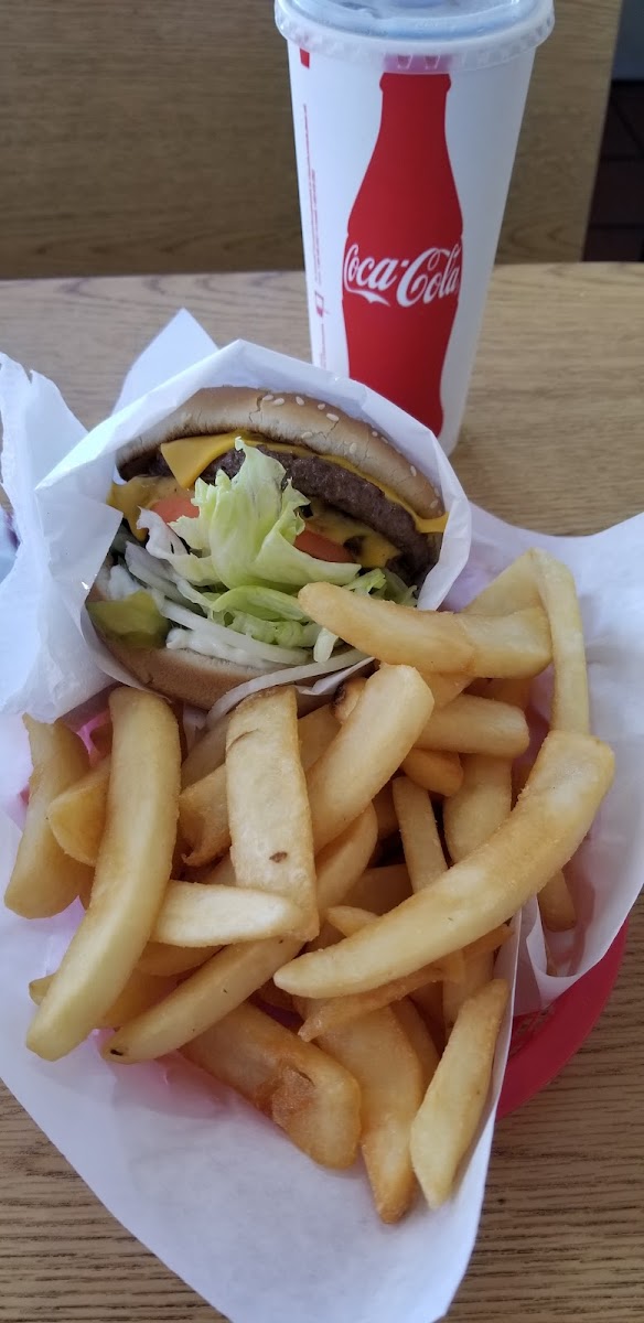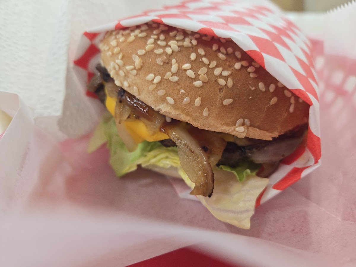 Wow. What a place. Double cheeseburger is no joke. Fat Patty's and tasty toppings. The size of these burgers and buns are equal so you're not getting a lot of bun nor a lot of meat. We ordered a combo meal with one order being a double cheeseburger and chili cheese fries. The second order was a double cheeseburger with onion rings. The owner son sat by the window to see if we were gonna be able to finish these meals. The burgers got down, the sides were half eaten. So much food but very delicious. Outside was a typical patio, with real nothing special about being outside. It was clean, but next to the street so a bit loud. But in all fairness, the food takes the cake in this and definitely makes you want to go back.